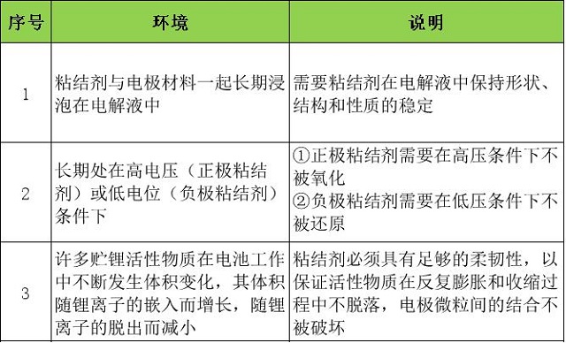 電極粘結劑環(huán)境特殊,因此需滿足特殊的性能要求。
