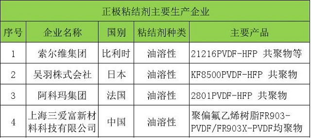 ②比利時的索爾維集團、日本的吳羽株式會社、法國的阿科瑪集團,都是PVDF粘結劑廠商中的佼佼者,共享全球鋰電池正極粘結劑的市場。