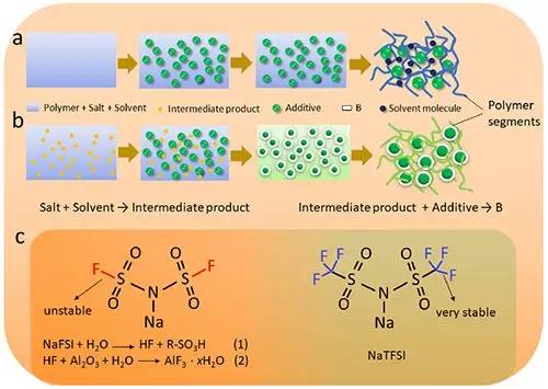 圖1.(a-b)SPE制備過程示意圖:a)傳統(tǒng)過程;b)所設(shè)計(jì)的過程;(c)NaFSI和NaTFSI的化學(xué)結(jié)構(gòu)