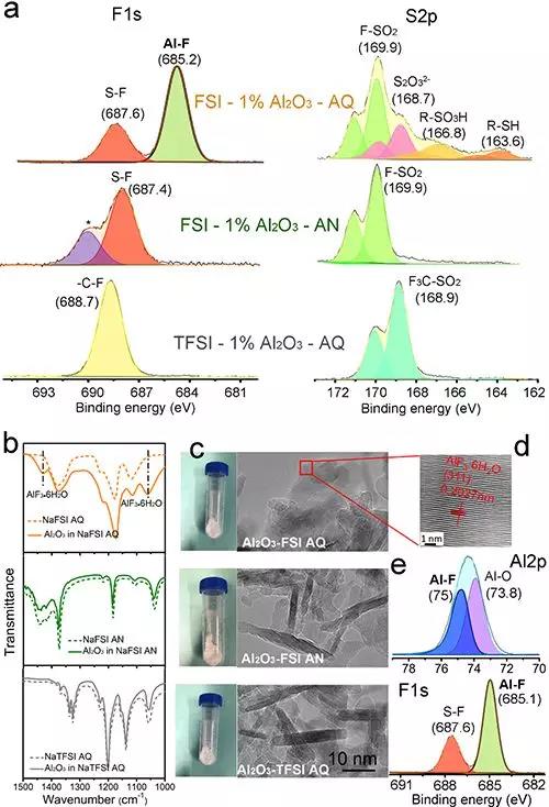 圖2. (a) FSI-1%Al2O3-AQ、FSI-1%Al2O3-AN和TFSI-1%Al2O3-AQ電解質(zhì)膜的XPS圖譜;(b) Al2O3分別在NaFSI水溶液、NaFSI乙腈溶液和NaTFSI水溶液中反應(yīng)后的紅外光譜;(c) Al2O3分別在NaFSI水溶液、NaFSI乙腈溶液和NaTFSI水溶液中反應(yīng)離心后的照片和TEM圖;(d-e) Al2O3在NaFSI水溶液中反應(yīng)離心后的高分辨TEM圖(d)和XPS圖譜(e)