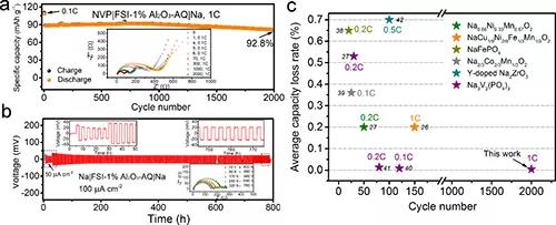 采用磷酸釩鈉(NVP)和金屬鈉(Na)分別作為正極和負(fù)極組裝固態(tài)電池NVP|SPE|Na,NVP|FSI-Al2O3-AQ|Na固態(tài)電池首周可逆比容量為110mAh/g,庫倫效率為93.8%,達(dá)到了采用液體電解質(zhì)時(shí)的水平。NVP|FSI-Al2O3-AQ|Na固態(tài)電池在1C倍率下循環(huán)2000周的過程中,庫倫效率始終保持在~100%,循環(huán)2000周以后容量保持率為92.8%,平均每周容量衰減率僅為0.0036%。對金屬鈉的對稱電池在100 μA/cm2的電流密度下可穩(wěn)定循環(huán)800h(圖3b)。電池循環(huán)過程中電化學(xué)阻抗譜也保持相對穩(wěn)定。采用該研究工作中所設(shè)計(jì)的SPE組裝的固態(tài)鈉電池的循環(huán)穩(wěn)定性是目前所報(bào)道的循環(huán)穩(wěn)定性最好的聚合物固態(tài)鈉電池(圖3)。