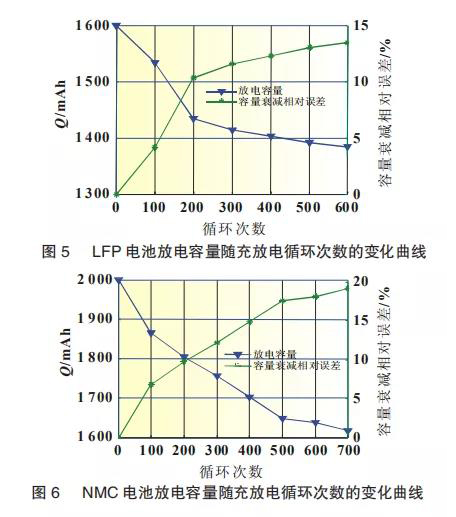 將1600mAh的LFP電池以充電0.5C放電0.5C進(jìn)行充放電循環(huán)實(shí)驗(yàn),共進(jìn)行600次循環(huán)實(shí)驗(yàn),以電池容量的80%作為電池失效判別標(biāo)準(zhǔn)。以100 為間隔次數(shù)對放電容量及容量衰減相對誤差的百分比進(jìn)行分析,如圖5所示。