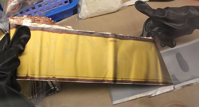 滿電態(tài)的負(fù)極,金色的是LiC6,鋰并沒有以金屬單質(zhì)的形式存在,將鋰離子電池充好電后拆解,圖中是在手套箱中操作,千萬別自己拆解充好電的鋰離子電池,LiC6在空氣中會(huì)自燃,也最好別自己更換手機(jī)電池,有可能操作不當(dāng)把電池劃破了,搞不好會(huì)起火爆炸。