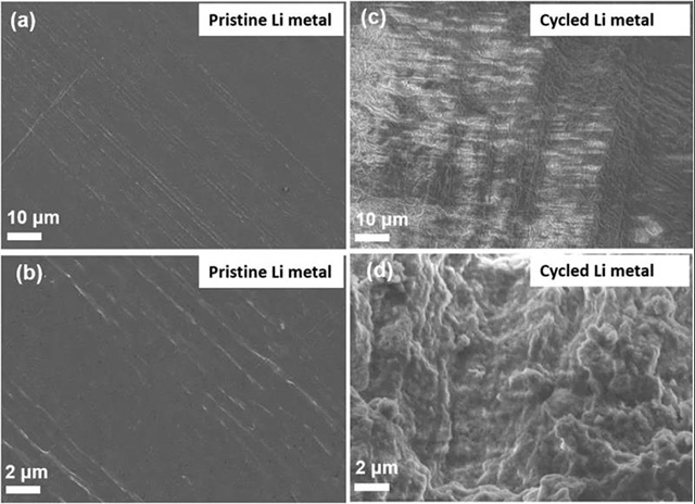 圖7. a,b)原始鋰金屬電極和c,d)循環(huán)鋰金屬電極在不同放大倍數(shù)下的比較SEM分析。