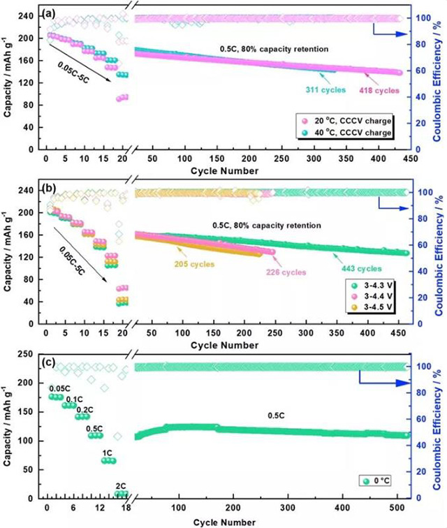 克服由于極化增加而導致在倍率升高時容量降低的另一種方法是增加陽極截止電壓。在0.05C的第一個循環(huán)中,隨著截止電壓升高,容量增加;但是,首圈庫侖效率顯示出相反的趨勢。不過,后者的值仍高于40℃時的第一個周期(陽極截止電壓為4.3 V),因此這種升高的截止電壓對于容量的提升是有利的。當逐步提高倍率時,對于4.5V的陽極截止電壓,直到0.5C時,容量仍保持最高(圖8b)。在高倍率能力和長期循環(huán)穩(wěn)定性這兩個目標之間顯然有一個最佳選擇,這是必須在電池管理系統(tǒng)中實現(xiàn)的,即更高的截止電壓和更高的充放電倍率下的CV階躍以及相對較低的倍率下較低的電壓截止值。值得注意的是,Li/SI10-05-70%PC / NCM811電池在0℃時也提供了相當高的比容量。隨后在0.5C下進行500次循環(huán)顯示出優(yōu)異的長期循環(huán)穩(wěn)定性,而沒有任何明顯的衰減。